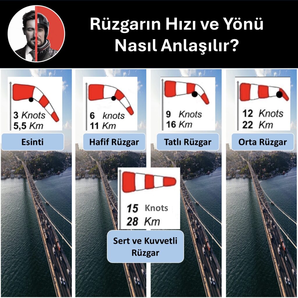 Rüzgar hakim geçişlerde, özellikle viyadüklerde, rüzgarın geliş yönünü ve hızını tespit etmeyi kolaylaştırmak amacıyla kırmızı ve beyaz renkli konik bayraklar (rüzgar çorabı) bulunmaktadır. Peki bu bayraklar nasıl okunur?
